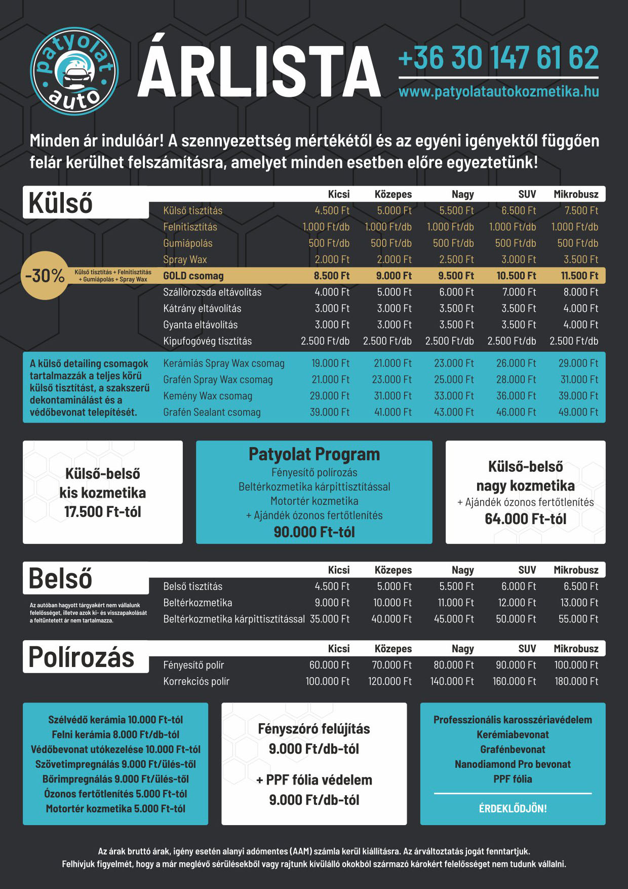 Gold külső mosás – Az alap, ami több mint alap: prémium külső tisztítás, ahol minden részlet számít. A karosszéria mellett a kerekek és a felnik is csillogni fognak. Ez nem gyorsmosó, ez kézműves munka. Fényszóró felújítás – Végre újra látsz: matt, sárgás fényszórók? Elfelejthetők. Speciális technológiával visszahozzuk az eredeti kristálytiszta állapotot. Nem csak szebb lesz, hanem jelentősen jobban is világít majd. Télen ez nem luxus, hanem biztonság. Üvegkerámia a frontra: az első szélvédő, az első ablakok és a külső visszapillantók professzionális kerámiabevonatot kapnak. Makulátlan tisztítás, zsírtalanítás, majd a védőréteg telepítése. Eredmény? Akár 12 hónapos védelem és extrém vízlepergetés – 60 km/h felett már ablaktörlő sem kell. Hó, jég, szennyeződés? Lepereg, mielőtt megtapadna. Ez a csomag a téli vezetés game changer-e. Látsz, látszol, biztonságban vagy.